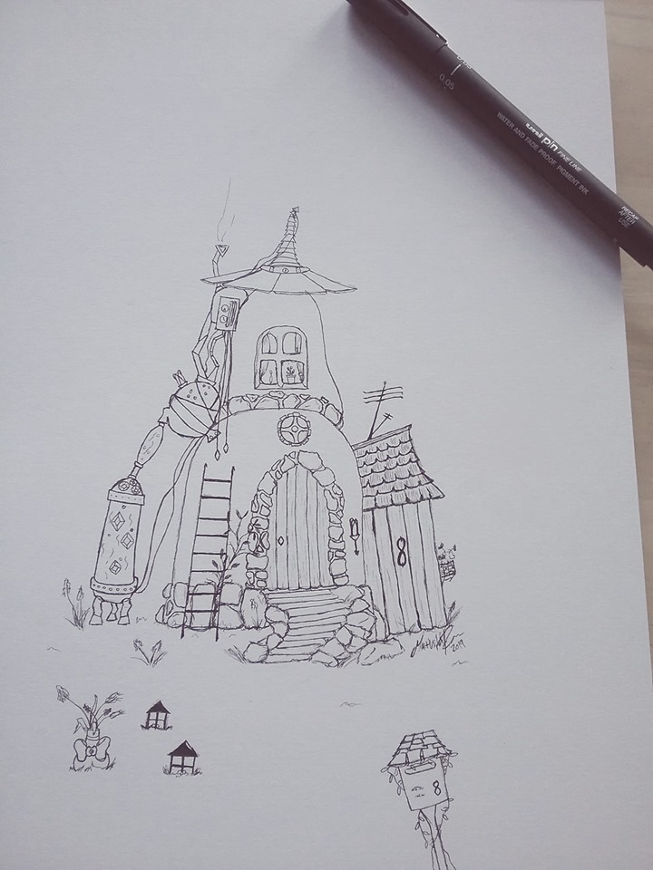 In the spring I started with ink pens, and instead of drawing what artists used to tell me to draw, I just drew what I felt like. Usually mushroom or robot fairytale worlds. I figured it was “allowed” since no one was looking. Some weeks later I had a crazy moment, and shared a drawing on Instagram where few people I knew were following me at that time. And even more crazy? It didn’t kill me 😛 Mistakes and all where right there for people to see, but they were so nice about it. I eventually felt brave enough to share on my personal Facebook profile, which lead to the next major point on my journey.